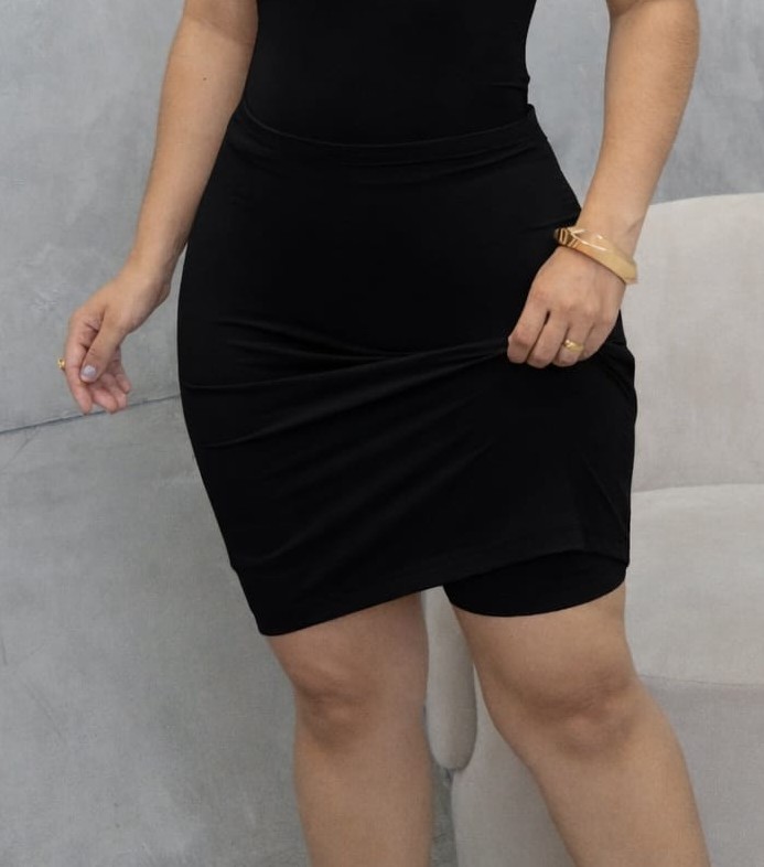 Esta peça revolucionária ,composta de um bermuda e um saiote em um só cós é a solução perfeita para velar a transparência,,ajudar no caimento e evitar o atrito entre as pernas.